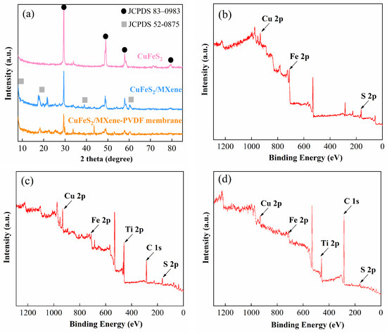 The phase composition and structure were inspected by XRD, as shown in Figure 2a. According to the standard XRD data for CuFeS2 (JCPDS 83-0983), the diffraction signals at 2θ = 29.4°, 49.0°, 57.9°, and 79.5° corresponded to the (1 1 2), (2 0 4), (3 1 2), and (3 1 6) planes of CuFeS2. The strong diffraction signals and sharp peak shapes indicated that CuFeS2 was crystallographically complete, and the arrangement of the atoms inside was relatively regular. Xu et al. [26] used XRD to characterize CuFeS2 and observed similar characteristic peaks. The characteristic peaks of the composite at 18.2°, 39.0°, and 60.1° were correlated with the (0 0 4), (1 0 4), and (1 1 0) planes of MXene [19], indicating the successful synthesis of CuFeS2/MXene. For CuFeS2/MXene, the peak corresponding to the (0 0 2) plane was shifted to a lower angle compared to the standard XRD data for Ti3AlC2 (JCPDS 52-0875), suggesting that some particles were loaded onto the layered structure of MXene [20]. In addition, the low intensity of some peaks belonging to MXene may be due to the formation of CuFeS2 on the MXene surface. XPS was applied to analyze the elemental composition of CuFeS2, CuFeS2/MXene, and the CuFeS2/MXene–PVDF membrane, and the results are presented in Figure 2b–d. Cu, Fe, and S were obtained from CuFeS2, and Ti was derived from MXene. The results of SEM, XRD, and XPS indicate the successful synthesis of the CuFeS2/MXene–PVDF membrane.