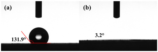 Contact angles of (a) PVDF membrane and (b) CuFeS2/MXene–PVDF membrane.