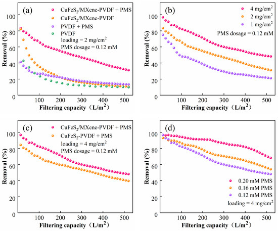 Catalytic membranes could degrade antibiotics through advanced oxidation techniques. Before the filtration experiment, the bonding strength between modified materials and the PVDF membrane was investigated by shear water flow (Table S1). Only when using vacuum filtration did CuFeS2/MXene easily fall off the PVDF membrane. However, after coating PEG and GA on the membrane surface, the loss of modified materials was significantly reduced. It was speculated that PEG and GA could effectively adhere CuFeS2/MXene to the surface of the PVDF membrane. At 0.02 MPa filtration pressure, the MOX removal efficiencies by different systems were investigated in continuous filtration (Figure 5a). The removal efficiency of MOX by the CuFeS2/MXene–PVDF membrane that activated the PMS system was 31.1%. Compared with other systems (removing 9.9%~13.4% MOX), it could be concluded that the catalytic membrane/PMS system promoted the removal of MOX through oxidative degradation. During the filtration process, CuFeS2/MXene on the surface of the catalytic membrane activated PMS and generated reactive species.