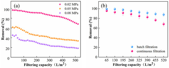 The effects of operating conditions on the removal of MOX: (a) filtration pressure and (b) batch filtration.