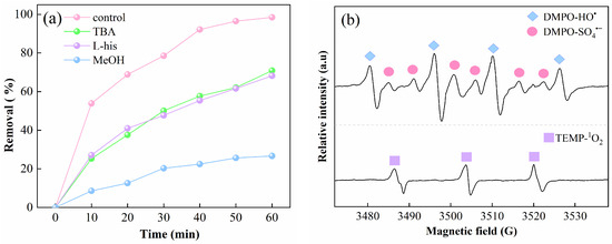 (a) Effects of radical scavengers on the removal efficiencies of MOX; (b) EPR spectra of DMPO-SO4•−, DMPO-HO•, and TEMP-1O2 adduct.