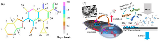 CFF was used to illustrate the regioselectivity of radicals attacking (Table S2), where f0 and f− corresponded to radical attack and electrophilic attack, respectively. The values of f0 and f− of the reactive sites were usually larger than other regions, such as the atoms (Num. 1, 2, 5, 13, 19, 21, and 29). In Figure 9a, different colors showed the numerical ranges of the Mayer bonds of MOX. Mayer bonds of N1-C14 and C22-O27 were 1.26 and 1.60, respectively, so it was difficult to remove N and O. The Mayer bonds of N1-C2, N1-C5, C10-C21, N19-C24, and C13-F29 were 0.62, 0.49, 0.78, 0.91, and 0.93, respectively, which were easily broken under the attack of active species. Therefore, the degradation of MOX may involve the cleavage of the nitrogen-containing heterocycle (NCH) (C1-C2 and C1-C5), the removal of the cyclopropyl group (C24-N19), decarboxylation (C10-C21) and defluorination (C13-F29). Similar MOX degradation pathways have been reported in other studies, such as g-C3N4/photocatalysis [47] and FeMnCoOx/PMS [48]. The mechanism of MOX removal by the catalytic membrane/PMS system included adsorption and degradation, as shown in Figure 9b. CuFeS2/MXene on the membrane surface was in contact with PMS, generating reactive species (SO4•−, HO• and 1O2) for the degradation of MOX on the membrane surface and in the solution. On the one hand, the PVDF membrane served as an effective carrier for CuFeS2/MXene, alleviating the problems of catalyst loss and difficulties in recycling. On the other hand, CuFeS2/MXene could enhance MOX removal by the PVDF membrane through advanced oxidation.