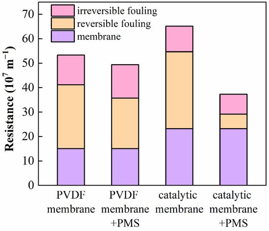 HA could produce membrane fouling through adhesion and blockage, which was selected as a common foulant to assess the anti-fouling performance of membranes. The contamination of the membrane surface was reversible and could be removed by hydraulic cleaning, while irreversible membrane fouling caused by pore blockage and adsorption required chemical reagents to restore water flux. Based on the water flux of membranes and Equations (5)–(7), the resistances in different membrane treatment systems were calculated, as shown in Figure 10. For the PVDF membrane, the oxidation of PMS itself could reduce the total resistance and reversible fouling resistance by 7.5% and 21.0%, respectively. However, PMS also oxidized HA into smaller pollutants, which was easier to enter the PVDF membrane’s pores, and irreversible fouling resistance increased by 13.2%. For the catalytic membrane, HA caused accumulation on the membrane surface, and reversible fouling resistance was even more serious. However, due to the small pore size of the catalytic membrane, HA could not easily enter the membrane pore, so irreversible fouling resistance was lower than that of the PVDF membrane. The calculated total resistance and reversible fouling resistance of the catalytic membrane/PMS system were 69.9% and 22.8% of the PVDF membrane, respectively. This indicates that membrane fouling could be effectively alleviated by the catalytic membrane/PMS system. The catalytic membrane could activate PMS efficiently, reducing the degree of membrane fouling. On the one hand, in situ, PMS activation occurred when the feed water passed through the catalytic layer of the membrane, which could enhance the repulsive interactions between pollutants and membranes according to the interface free energy calculations [24]. On the other hand, the active species produced by activating PMS could promote the degradation of pollutants with high molecular weight into smaller fractions and oxidize the hydrophobic matter into hydrophilic matter [7,49]. Although the loading of CuFeS2/MXene increased the inherent resistance of the catalytic membrane, the total resistance and reversible fouling resistance were reduced through PMS activation.