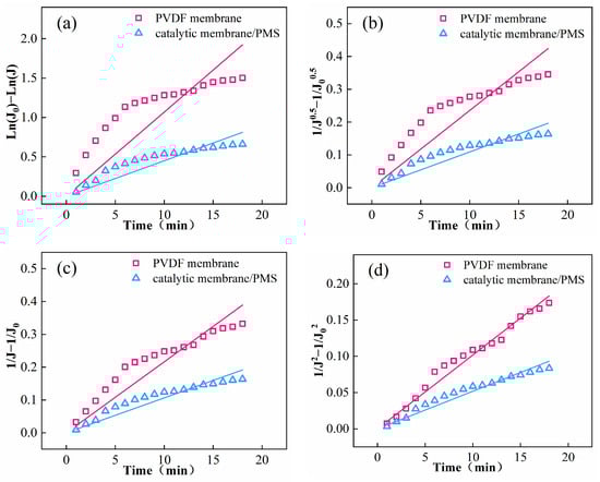 Hermia modeled and analyzed the filtering process (Equation (11)), and the different values of n corresponded to four single models [50]. The PVDF membrane and catalytic membrane were used to filter HA in order to study the formation mechanism of membrane fouling (Figure 11 and Table S3). The Cake filtration model (R2 = 0.9944) might explain the formation of PVDF membrane fouling compared with other models (R2 = 0.9276~0.9710). Thus, it could be assumed that HA formed a cake layer on the surface of the PVDF membrane.