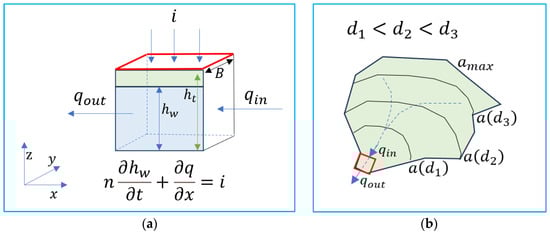 (a) Continuity equation of the hydrological model according to [50,70,71], and (b) its exemplification at basin scale considering the Dynamic Contributing Area (DCA) a(d). The red box representes a single cell of the basin domain.