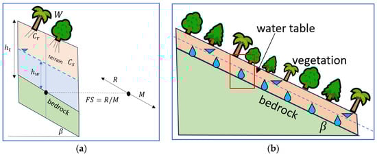 (a) Continuity equation of the slope stability model according to [50,70,71], and (b) its exemplification at slope scale.