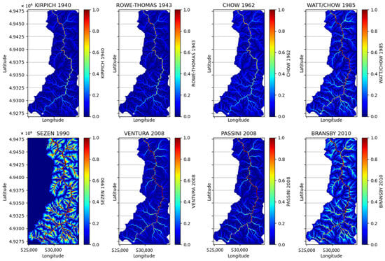 Evaluation of surface corrivation time (normalized with respect to the maximum value of 1 h) using some formulas from the literature [85]: Kirpich 1940, Rowe-Thomas 1943, Chow 1962, Watt-Chow 1985, Sezen 1990, Ventura 2008, Passini 2008, and Bransby 2010.