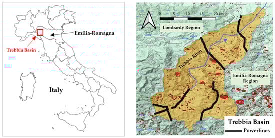 Location of the case study conducted within the Trebbia watershed basin in Emilia-Romagna region (Italy). The high voltage powerlines settled across the basin are shown compared to the location of rainfall-induced landslides from the IFFI census (red polygons).