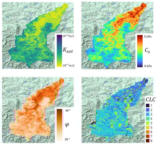 Preparatory processing of the soil data was carried out to evaluate the key parameters required for rcrit computation: the saturated permeability Ksat, the soil thickness ht, the friction angle φ, the soil and root cohesion Cs and Cr, and the vegetation surcharge W. Worldwide and national databases and literature studies [88,90,92,93] were investigated to retrieve these parameters for the investigated area, as depicted in Figure 6. More precisely, the Soil Grids database [88] was considered for retrieving soil texture distribution across the investigated area, assessing the % of fine (sand, silt, and clay) and coarse soils, and extracting the predicted shallow soil thickness ht. Conversely, Ksat distribution and unsaturated soil parameters were obtained from [89,90]. For friction angle and cohesion stability parameters, reference values and ranges [43,55] were considered for the main soil classes and then spatially distributed using the Soil Grids texture data. All the data were converted to a common raster format, “.map” [94].