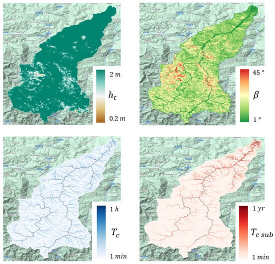Figure 7. Representation of the soil thickness ht, slope angle , superficial corrivation time Tc, and the subsurface corrivation time Tc_sub for the Trebbia watershed basin located in Emilia-Romagna region (Italy) obtained from the HydroSHED DEM and [85].