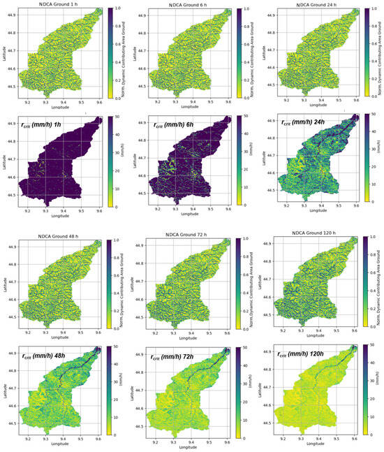 Evaluation of the Normalized Dynamic Contributing Area (NDCA) and representation of the critical precipitation intensity rcrit, in mm/h, for increased rainfall durations: 1 h, 6 h, 24 h, 48 h, 72 h, and 120 h.