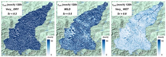 Representation of the critical precipitation intensity rcrit, in mm/h, for increased initial soil moisture condition for rainfall duration of 120 h. A reduction of rcrit is visible due to increased soil moisture.