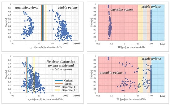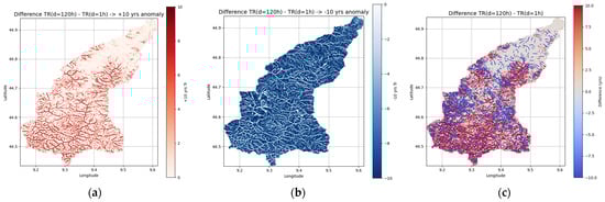 Figure 10 shows the variation in the critical TR for landslide triggering as a function of precipitation duration d. In red (Figure 10a) are the highlighted areas where the return time of critical rain rate rcrit is greater for prolonged rain (120 h) than for short rain (1 h). In blue (Figure 10b) are the highlighted areas where the return time of critical rain is lower for prolonged rain (120 h) than for short rain (1 h). The TR anomaly was evaluated in a range scale of ± 10 years. The distribution of red areas compared to blue ones is distinguished as follows: the red areas (Figure 10a) show the mountain ridges characterized by high gradients and low values of the subsurface contributing area, which are highlighted as mostly susceptible to intense but short rains (TR1h < TR120h); the blue areas (Figure 10b) highlight slopes characterized by lower gradients and higher values of the subsurface contributing area (TR120h < TR1h); the grey areas (Figure 10c) are those in which there is not such a significant tendency to vary the return time of critical rain as a function of duration (TR1h ≈ TR120h).