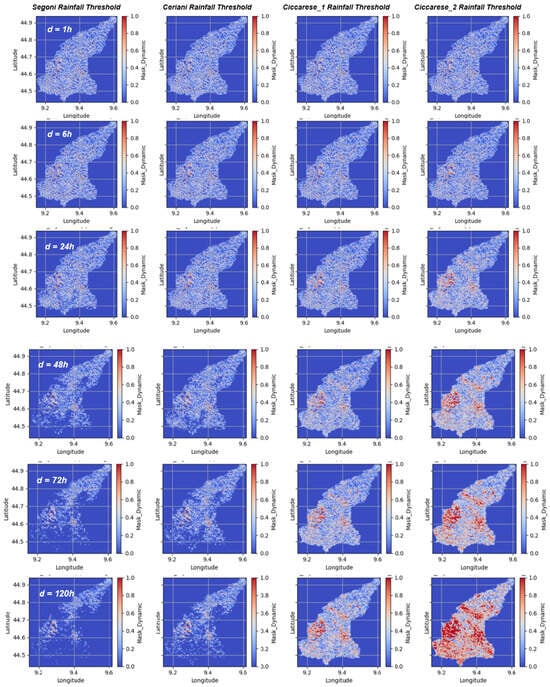 The script contains the implementation of the SLEM model shown in Equations (22) and (23), in which all the hydrogeological and stability parameters previously evaluated are ingested. The program evaluates the “hazard maps”, showing that the critical rainfall ratio rcrit is able to trigger slope failure for a series of reference rainfall durations, typically 1 h, 3 h, 6 h, 12 h, 24 h, 48 h, 72 h, and 120 h. For a fixed duration, the areas which admit lower rcrit are more prone to shallow landslide failure.