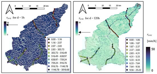 Figure 8 shows the Normalized Dynamic Contributing Area (NDCA = a(d)/amax, between 0–1) and the value of the critical precipitation intensity rcrit for durations of 1 h, 6 h, 24 h, 48 h, 72 h, and 120 h. As can be noticed, the NDCA obtained from DCA (Equation (19)) tends to progressively increase as the duration of the rain increases. Looking at Equations (22) and (23), the DCA term a(d) becomes predominant, increasing d, causing a reduction of the rcrit. Considering similar velocities of the subsurface flow, with increasing time, the NDCA tends to the maximum asymptotic value amax, following a monotonic function. In fact, if the picture of duration 1 h is compared with the one of duration 120 h, a drastic reduction of rcrit can be observed (from 50 mm/h to 5 mm/h, about 1 order of magnitude). This result has a physical meaning: increasing the duration of precipitation, watershed terrain tends to saturate, and the upper areas start to progressively contribute to the subsurface flow, reaching a regime condition when a(d) = amax.