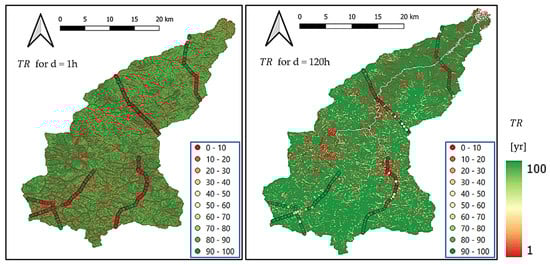 Once the value of the critical rainfall intensity has been obtained, the return time (TR) of that rain was evaluated using the IDF curves available for the Trebbia River basin [100,101]. The TR of precipitation represents an indirect estimate of the magnitude of the expected landslide phenomenon [2]. Using local IDF parameters listed in Table 3, the TR was assessed from the critical intensity rcrit and duration d pairs to retrieve information about the event magnitude. Six maps were obtained for the duration of 1 h, 6 h, 24 h, 48 h, 72 h, and 120 h. Then, to estimate the variation of the expected critical TR with the duration d of the precipitation, the difference between the TR maps relative to 120 h (“long-lasting rain”) and to 1 h (“short rain”) was carried out.