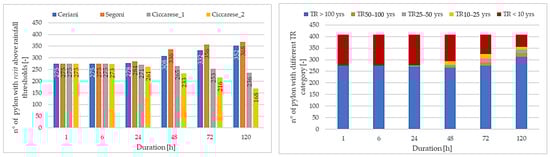 Considering the frequency-magnitude theory [2], the most destructive shallow landslide episodes are expected from rainfall events with larger TR. These rare and catastrophic events have a relatively low frequency. However, from a probabilistic hazard perspective, electro-energetic stakeholders are interested mainly in coping with high-frequency failures because possible power outage needs to be reduced to the minimum during non-extreme events [27]. Therefore, for ridges, short and intense rains such as showers or thunderstorms represent the most hazardous trigger (TR1h < TR120h), while for slopes, these are represented by prolonged and low-intense precipitation (TR120h < TR1h). These results are confirmed by historical surveys [15,99] and could be explained in these terms: intense and short rains can saturate of faster the thin soil covers across ridge areas while prolonged rains can have a greater impact on the local hydrogeology, which contributes significantly to progressive (but slower) terrain saturation of the terrain slope over time. According to [46,47,50,78], this dynamic is directly imputed to the characteristic of the hydrological model chosen for simulating subsurface flow.