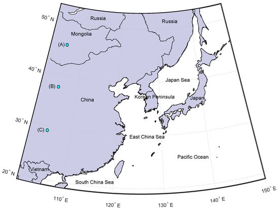 Location map of the study area (18° N∼55° N, 100° E∼150° E). (A), (B), and (C) are three grid points.