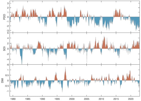 The monthly time series of PDO, SOI, and DMI from 1979 to 2022.