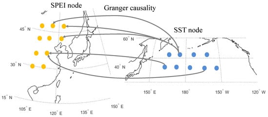 where , , and are constant model parameters, and and are white noise terms. The restricted model Equation (3) is regarded as the null model for the hypothesis that is not dependent on . Then, the hypothesis is tested by comparing the residuals of these two models: when the sum of the squared residuals for the complete model is significantly smaller than that for the restricted model , is thought to be caused by (denoted as ). Then, the matrix records the results of the GC test, and only 5% of links between SPEI and SST fields are kept for further network analysis, while the other 95% are discarded as non-significant links [54]. Then, the summation of each column of denotes the out-degree of the SST node, while the summation of each row denotes the in-degree of the SPEI node. The potential relationships between large-scale climate variations and SPEI can be partly revealed by the spatial patterns of out-degrees and in-degrees of the coupled climate networks. Figure 3 shows the schematic diagram of the coupled climate network between SST and SPEI.