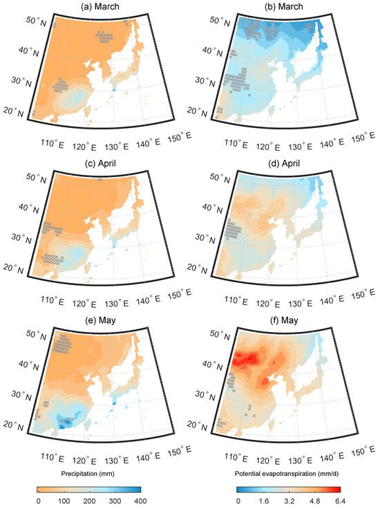 The average precipitation (a,c,e) and potential evapotranspiration (b,d,f) in March, April, and May from 1979 to 2022. The stippling indicates the grids with nonstationary precipitation and potential evapotranspiration time series at the significance levels based on the ADF test.
