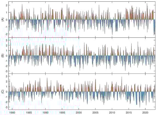 Monthly SPEI time series from 1979 to 2022 for the three grid points labeled by (A), (B), and (C) in Figure 1, positive and negative values of SPEI are indicated by light brown and blue colors.