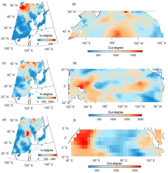 In-degree fields of SPEI and out-degree fields of SST in the coupled climate networks. (a,b): East Asia vs. North Pacific; (c,d): East Asia vs. Central Pacific; (e,f): East Asia vs. Central Indian Ocean.