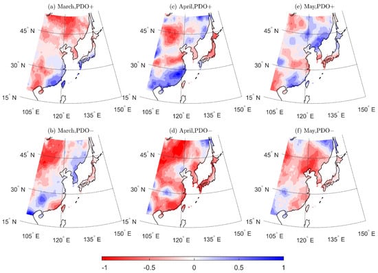 Composite maps of SPEI for positive and negative phases of PDO in March, April, and May from 1979 to 2022.