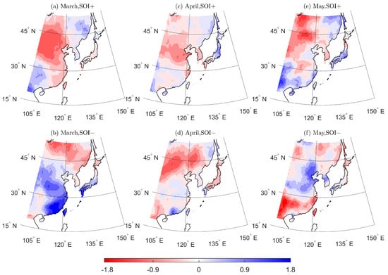 The average SPEI values for March, April, and May during the positive and negative phases of the PDO, SOI, and DMI are presented in Figure 7, Figure 8 and Figure 9, respectively. In the case of PDO, the spatial patterns of SPEI in March and April do not exhibit a complete reversal between the positive and negative phases. In March, droughts are prevalent, with relatively small wet areas. During the positive phase of PDO, a belt of wetter conditions emerges, spanning from the southeast coast of China to the south coast of Japan. In contrast, during the negative phase, this belt shifts northward, extending from South China to the Korean Peninsula and Northeast China. In April, drought conditions are more severe in the negative PDO phase compared to the positive phase. However, in May, the spatial pattern of SPEI in the positive and negative PDO phases begins to exhibit a more distinct opposition, with wetter areas in the positive phase tending to become drier in the negative phase, and vice versa. The proportions of each SPEI-based category of dryness/wetness during the positive and negative PDO phases in March, April, and May are summarized in Table 2. An opposing effect of positive and negative PDO on SPEI has been observed; Figure 7 and Table 2 do not indicate the presence of extreme wetness or dryness conditions.