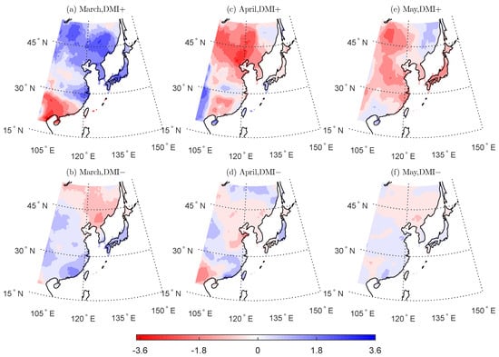 In March, the remote impact of ENSO on SPEI over East Asia during the positive and negative phases is nearly opposite (Figure 8a,b). In the positive phase of SOI (La Niña), drought areas are primarily located in Northern China, while they shift northward to Northeast China and Russia in the negative phase of SOI (El Niño). In April, the drought area expands in both La Niña and El Niño phases, and the difference in their impact on SPEI over East Asia is not significant. However, in May, Southern China and Japan experience wetter conditions during La Niña but drier conditions during El Niño. In the El Niño phase, the wet area shifts to the central part of the study area, and drought conditions become less severe in the northern part. The remote impact of IOD on SPEI over East Asia in March, April, and May is inconsistent. During the positive phase of DMI, most of East Asia experiences wetter conditions in March but becomes drier in April and May (Figure 9). In the negative phase of DMI, the contrast between wet and dry areas in the spring season is less pronounced. Generally, the southern part of the study area tends to be wetter, while the northern part is drier. The proportions of each category of dryness/wetness based on SPEI during the positive and negative phases of SOI and DMI in March, April, and May are summarized in Table 3 and Table 4, respectively. It is noteworthy that extreme wetness or extreme dryness may occur in the positive phase of DMI in March and April.