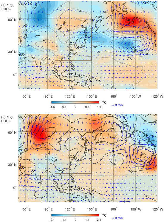 Composite anomalies of geopotential height (gpm; contour with numbers), air temperature (°C; shaded), zonal and meridional wind anomalies (blue vectors) at 850-hPa level in positive (a) and negative phases (b) of PDO.