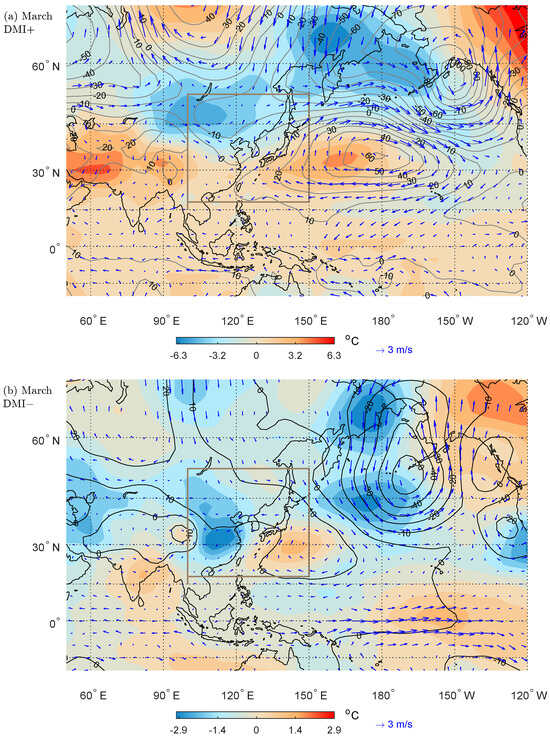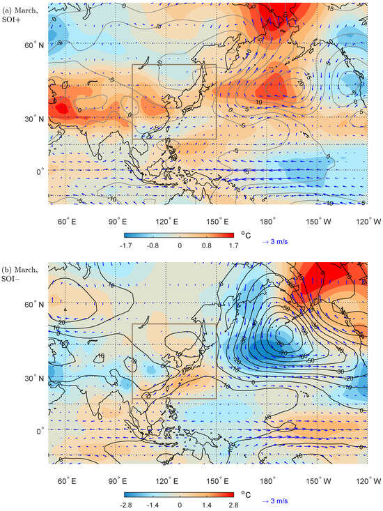 In this study, the remote impacts of PDO, ENSO, and IOD on spring meteorological drought over East Asia were revealed by composting the SPEI values for the positive and negative phases of these climate variations in March, April, and May, respectively. Previous studies have revealed that the PDO might exert a modulating effect on ENSO teleconnections in winter by shaping winter monsoon [72,73]. Also, the combined effect of IOD and ENSO is very complex [74]. Since we only focus on the spring meteorological drought from 1979 to 2022, the positive and negative of these three climate variations are not further distinguished into more classes. We speculated that the spatial patterns of spring meteorological drought could be partly explained by the atmospheric circulation patterns in different phases of climate variations. Figure 10, Figure 11 and Figure 12 present the atmospheric circulation anomalies for positive and negative phases of PDO, ENSO, and IOD in May and March, respectively. Figure 10a,b correspond to Figure 7e,f. Lower air temperatures, strong winds bringing moisture from the sea, and lower air pressures together contributed to the wet conditions, while higher air temperatures, strong winds without moisture, and higher air pressures are responsible for dry conditions. In addition, the atmospheric circulation anomalies presented in Figure 11a,b correspond to the composite maps of SPEI Figure 8a,b. The spatial patterns of air temperatures over the Central Pacific are consistent with the spatial pattern of SST in positive and negative phases of ENSO [75]. Moreover, higher/lower pressure centers associated with anti-cyclones and cyclones are located in the North Pacific. The large-scale circulation patterns partly explained the spatial pattern of drought in the positive phase of ENSO (La Niña). In the negative phase of ENSO (El Niño), Southern China and Japan are wet due to the warmer SST at the South/East China Sea and the southwest wind transporting vapor to South China and Japan. IOD is considered a counterpart to the climate-driving ENSO in the equatorial East Pacific. Yang et al. [76] and Wu et al. [77] both found the remote impact of IOD on summer precipitation over East Asia. Figure 12a,b correspond to Figure 9a,b. In the spring season, especially in March, the difference in atmospheric circulation patterns over the Indian Ocean is not obvious. Then the difference between SPEI patterns in positive and negative phases of DMI is probably explained by the air temperature anomalies. The only exception is Japan, which is wet in both the positive and negative phases of DMI due to the strong winds transporting vapor from warmer SST to land (Figure 12b).
