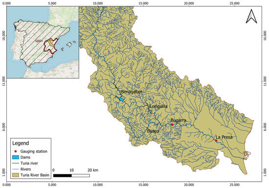 The Turia River basin is located in the eastern part of the Iberian Peninsula, in Spain. Administratively, it falls under the jurisdiction of the Júcar River Basin Agency. The basin covers a total area of 6394 km2 and is drained by the Turia River, which ultimately flows into the Mediterranean Sea (Figure 1). The region experiences a Mediterranean semi-arid climate characterized by irregular rainfall and seasonal summer scarcity, particularly during peak irrigation demands. On average, the annual precipitation is 450 mm/year [37]. The focus of this study is the lower-middle basin of the river, which is situated between the Loriguilla reservoir and the water supply intake for Valencia, referred to as “La Presa”. This area is heavily impacted by human activities and holds the highest quantitative and qualitative significance due to the concentration of environmental uses and pressures within it. The nitrate concentrations in the Loriguilla reservoir inflows remain consistently low, and within the reservoir itself, there is no perceptible impact on nitrate levels, either reduction or increase.