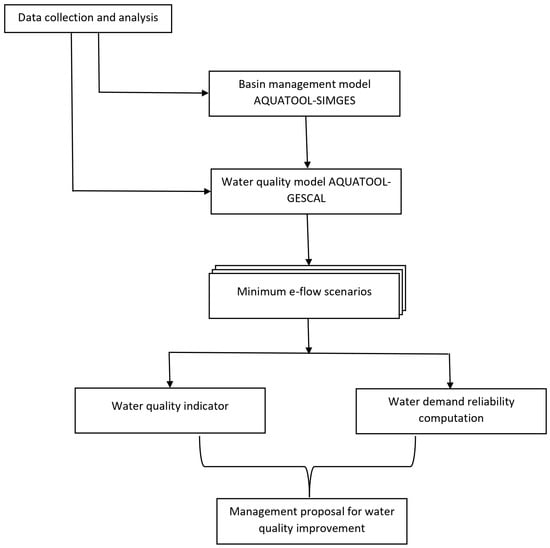 The methodology unfolds in a structured sequence of steps, as illustrated in Figure 2. It begins with an initial phase comprising data collection, data analysis, and an in-depth exploration of the challenges encountered within the basin. Then, a two-step modeling approach is used. First, a basin management model is developed to suit the basin’s specific features (SIMGES model). Next, a water quality model is created (GESCAL model) which is linked to SIMGES within the AQUATOOL DSS [38]. These models draw upon input data primarily encompassing physical characteristics and operational rules. They are primed to simulate minimum flow scenarios, generating water quality indicators that enable comparative assessments of different scenarios. Simultaneously, water demand reliability computations are conducted, a pivotal criterion in the context of e-flow considerations. The final phase of the study entails the presentation of a proposed management scenario for water quality improvement, offering a comprehensive strategy for addressing water quality issues within the basin.
