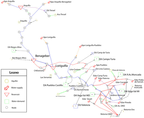 Topology of the water management model after the change made for Valencia water demand intake (red dashed line).