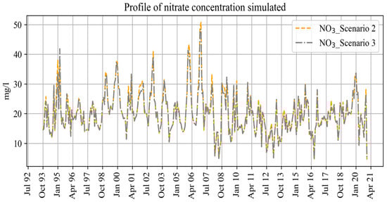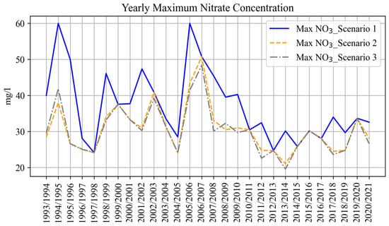 Figure 4 illustrates an overview of the annual maximum nitrate concentrations obtained for the three simulated scenarios. Each scenario exhibits varying peaks in nitrate concentration levels, with some instances reaching as high as 60 mg/L. Notably, these values exceed the regulatory threshold set by the EU directive 2020/2184 of the European Parliament and the Council on 16 December 2020, which specifies water quality standards for human consumption [41]. The nitrate concentration levels in the scenarios range between 20 mg/L and 60 mg/L, highlighting a consistent concern regarding elevated nitrate levels at the intake point for the water supply to Valencia.