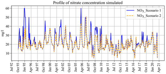 Evolution of nitrate concentration simulated using the GESCAL model for Scenarios 1 and 2.