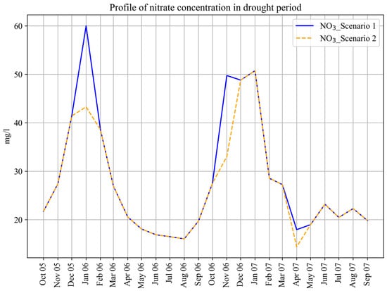 Evolution of nitrate concentration simulated using the GESCAL model for Scenarios 1 and 2 during the drought period.