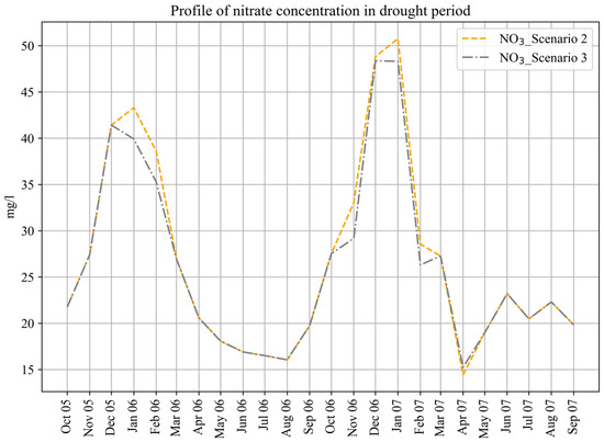 Evolution of nitrate concentration simulated using the GESCAL model for Scenarios 2 and 3 during the drought period.