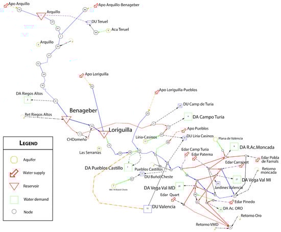 The data for the water management model were obtained from the hydrological plan of the study basin, which includes data related to storage and operating rules of reservoirs, flows in channels and river stretches, water demand in the basin (urban and agricultural), e-flow regimes, aquifers, etc. In the case study analyzed in this work, this information was available in the Hydrological Plan of the Júcar River Basin [37]. This dataset was instrumental for understanding the structure and dynamics of the study area and shaping the water management model.