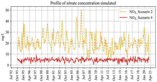 Evolution of nitrate concentration simulated using the GESCAL model for Scenarios 2 and 4.