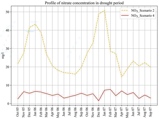 Evolution of nitrate concentration simulated using the GESCAL model for Scenarios 2 and 4 during the drought period.
