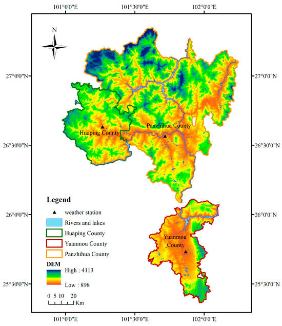 The data used in this study were obtained from the China Meteorological Data Network (https://data.cma.cn/, accessed on 15 January 2024), covering three meteorological stations in Panzhihua, Yuanmou, and Huaping during the period of 1988–2019 for day-by-day meteorological element data. The selected meteorological elements include daily relative humidity (RH), sunshine hours (n), daily average temperature (Tmean), daily maximum temperature (Tmax), daily minimum temperature (Tmin), average wind speed (u), etc.