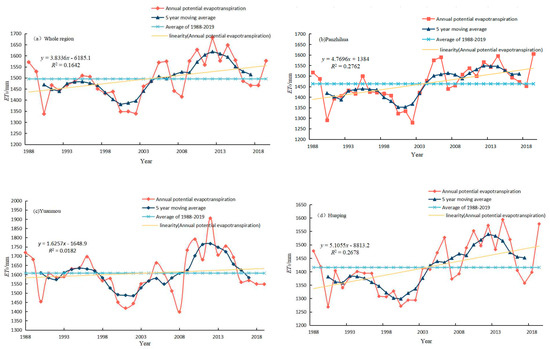 Process of interannual variation in ET0 in the middle region of the Jinsha River Dry-hot Valley and its segments, 1988–2019.