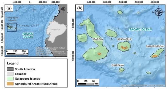 (a) Location of the Galapagos Islands concerning continental Ecuador; (b) Location of the islands of the Galapagos with agricultural activity: San Cristobal, Santa Cruz, Isabela, and Floreana.