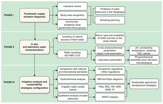 The method consists of a study through the inventory, sampling, and analysis of quality and hydrochemistry of the natural water sources on the four islands associated with the agricultural sectors of the Galapagos. A hydrochemical characterisation is carried out to classify the type of water. Furthermore, the in situ and laboratory parameters are compared with national and international environmental regulations, and indices are calculated to diagnose water quality for irrigation. With the hydrochemical characterisation and data on water quality parameters for irrigation, sustainable agriculture strategies are formulated. The characterisation and analysis of water quality resources included three work phases: (i) freshwater supply situation diagnosis, (ii) in situ and laboratory water characterisation, and (iii) irrigation analysis and sustainability strategies configuration (Figure 2).