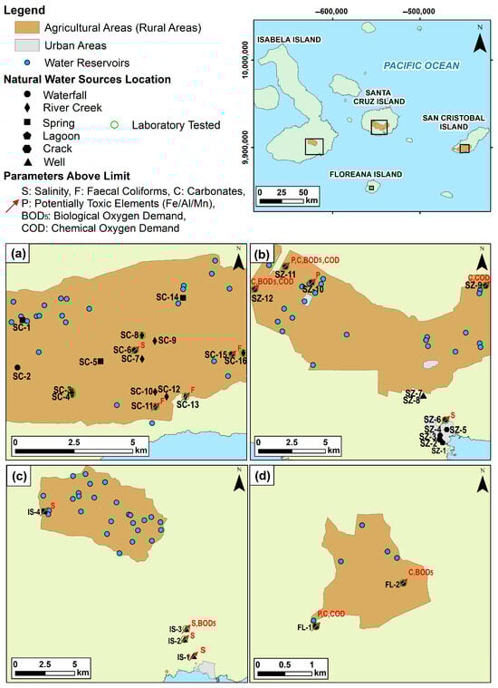 Location map of natural water sources inventoried in the Galapagos Islands, indicating the type of source and the parameters above the allowed limit. (a) San Cristobal; (b) Santa Cruz; (c) Isabela; and (d) Floreana. Source codes are detailed in Table S2.