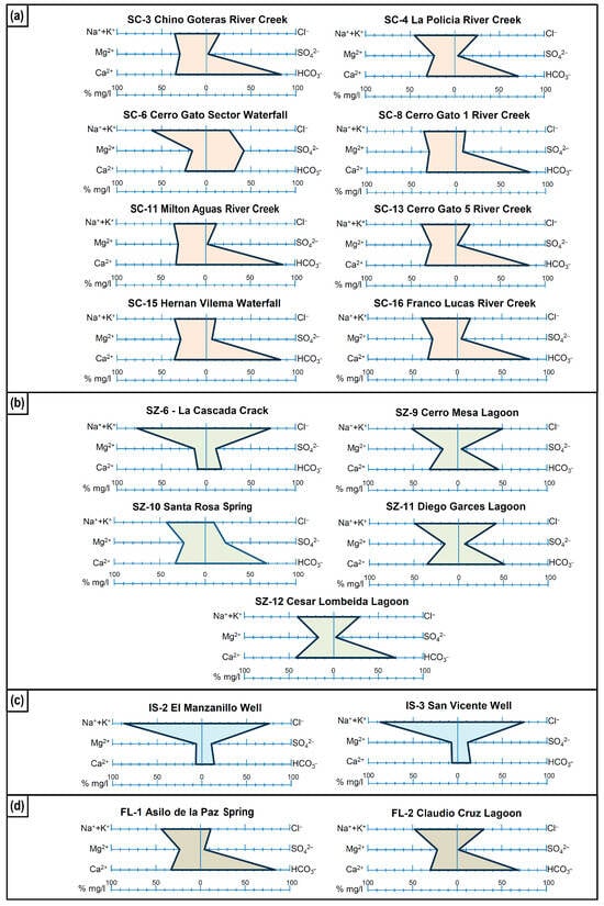 Stiff diagram of the seventeen water sources analysed, where the tips of the polygons show the predominant cations (left) and anions (right): (a) San Cristobal; (b) Santa Cruz; (c) Isabela; and (d) Floreana.