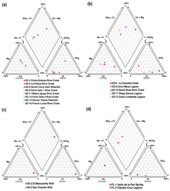 Piper diagrams obtained for the samples analysed from the water sources: (a) San Cristobal (Two water types: calcium/magnesium-bicarbonate waters and a mixture of sulphate and/or sodium–calcium–chloride waters); (b) Santa Cruz (Three water types: sodium-chloride waters, calcium/magnesium-bicarbonate waters, and a mixture of calcium/magnesium-bicarbonate waters with sodium-chloride waters); (c) Isabela (One water type: sodium-chloride waters); (d) Floreana (One water type: calcium/magnesium-bicarbonate waters).