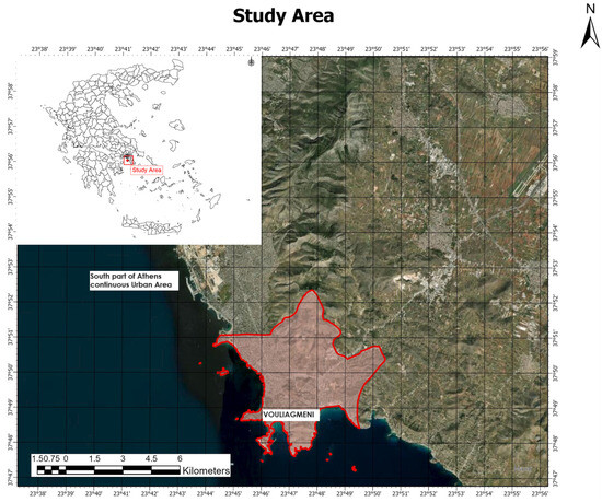 The study area is the greater area of Vouliagmeni, located in the southern region of Athens in Attica, Greece (Figure 1). It is renowned for its unique geological features and coastal environment. The decision to focus the current application within the area of Vouliagmeni is driven by several pragmatic and methodological considerations. This area was selected because it was highlighted in previous research [35] as vulnerable to the impacts of coastal flooding. Moreover, a smaller, more contained area allows for a more focused analysis of local resilience factors. Lessons learned in this focused setting can guide adjustments and enhancements when scaling to larger regions. Encompassing urban, suburban, and rural zones, alongside both natural and artificial coastlines, this area forms part of the continuous Athens Urban Area, the financial capital of Greece. The area is characterized by a high density of pine trees and a very high level of tourist activity. The study area, due to its orientation and the morphology of the wider area, is mainly affected by wind waves originating from the southwest, south, southeast, east, northeast, and north directions; the prevailing winds are northerly. The average range of sea level variation in the study area is small, and generally, the influence of tides on the movement of sea masses is not significant.